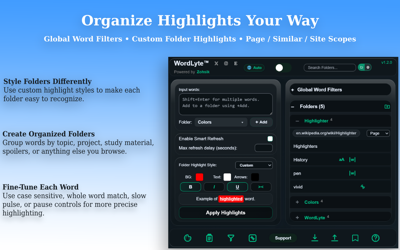 Highlight individual words, keywords, or short word groups across supported websites so the terms that matter most are easier to spot while you read.